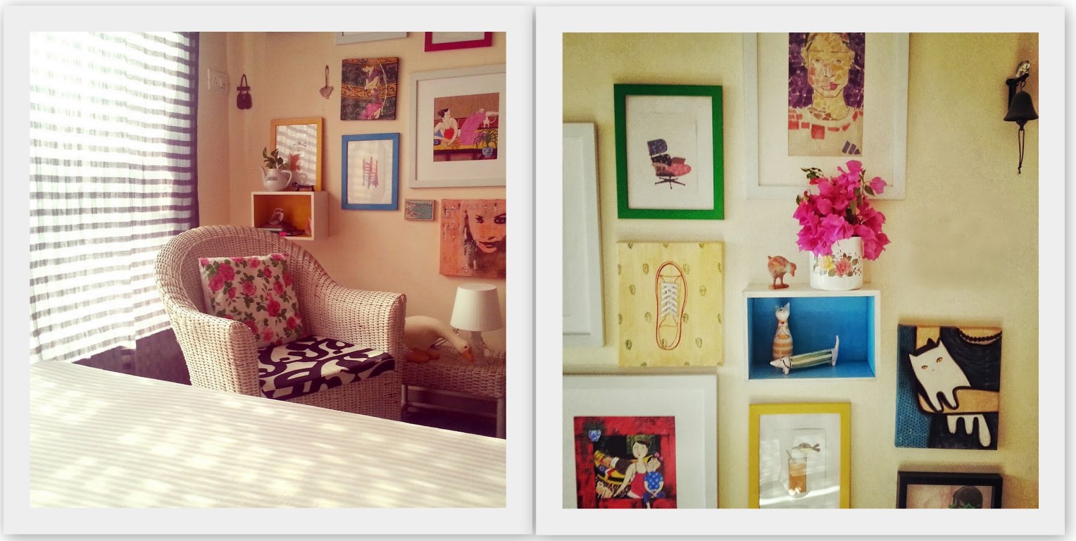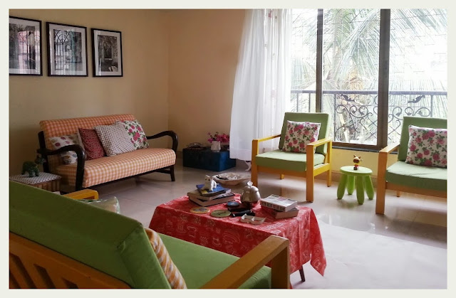 When I sat down to design the current space, one things was pre-decided. Limited budget. I reused and reupholstered old furniture in interesting paints and fabrics. And threw in more colors and patterns in the form of cushions. Random patterns and colors came in together and started co-existing nicely. All things random is what I would like to call it."